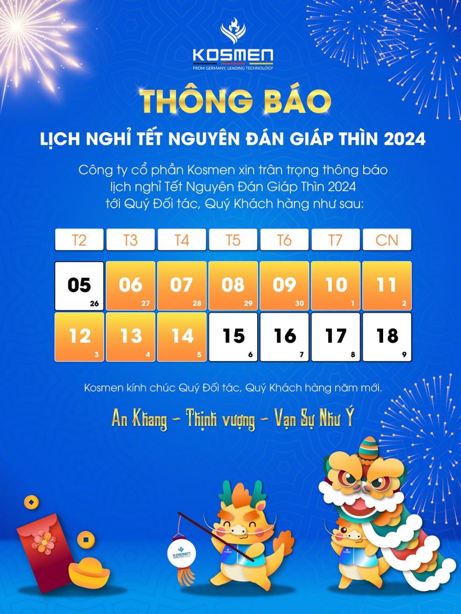 Kosmen chân thành gửi lời cảm ơn đến Quý Khách Hàng, Quý Đối Tác đã luôn gắn bó, dành lòng tin và lựa chọn sử dụng sản phẩm, dịch vụ của công ty chúng tôi. Kính chúc Quý khách hàng đón xuân vui vẻ và có một Tết Giáp Thìn 2024 với nhiều niềm vui, hạnh phúc bên gia đình và bạn bè. Chúc Quý khách một năm mới An Khang - Thịnh Vượng - Vạn Sự Như ý và nhiều may mắn!